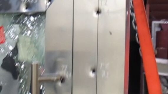 Close-up of bullet holes in aluminium door.